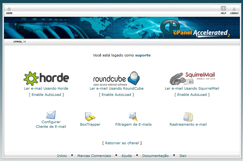Solução completa de correio eletrônico: caixas postais POP3 com SMTP, suporte IMAP, redirecionamentos, filtros, listas, webmail, anti-SPAM, anti-vírus, SPF, DomainKeys, administração de registros MX, etc.